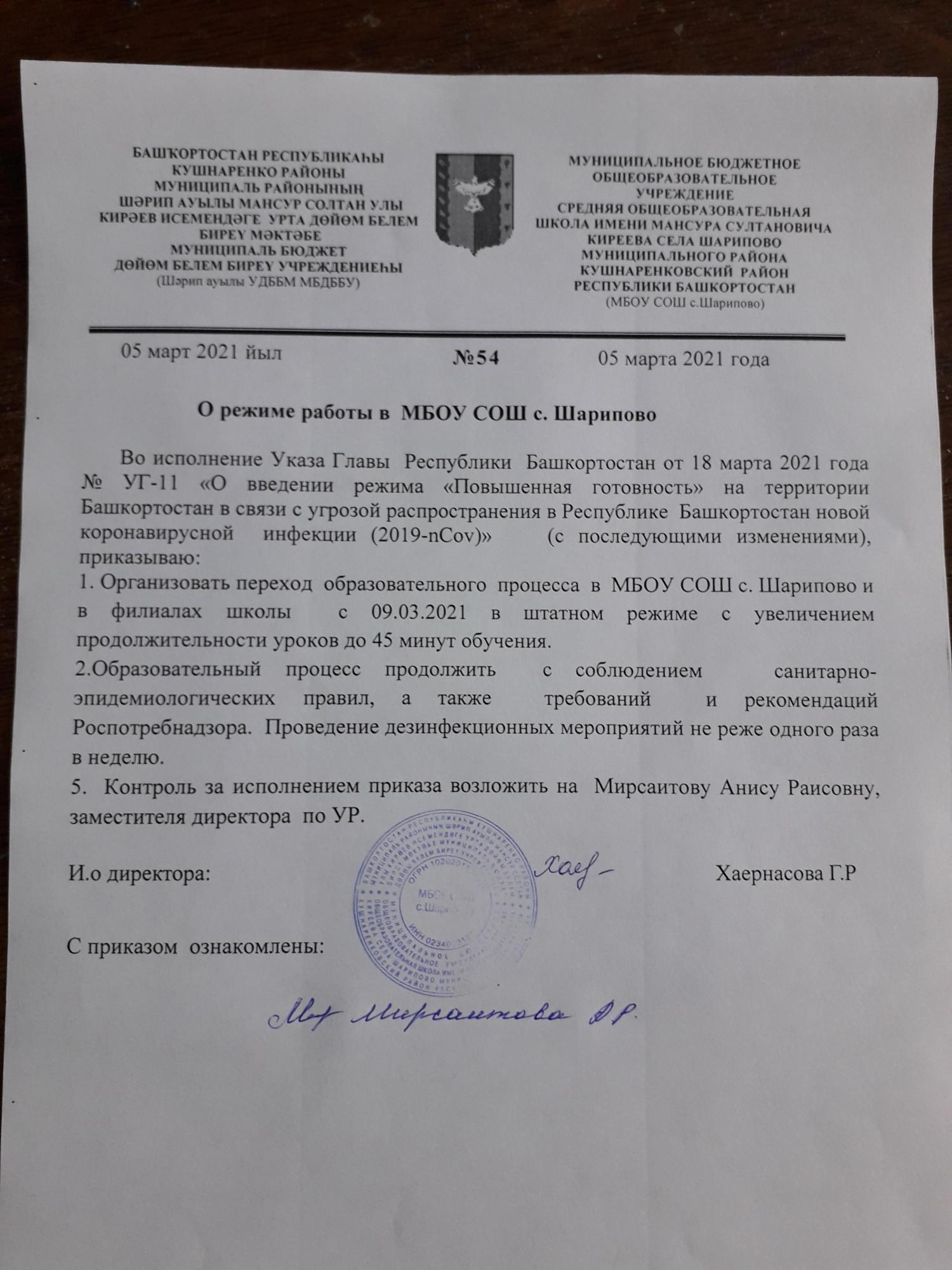 Приказ о режиме работы в МБОУ СОШ с.Шарипово
