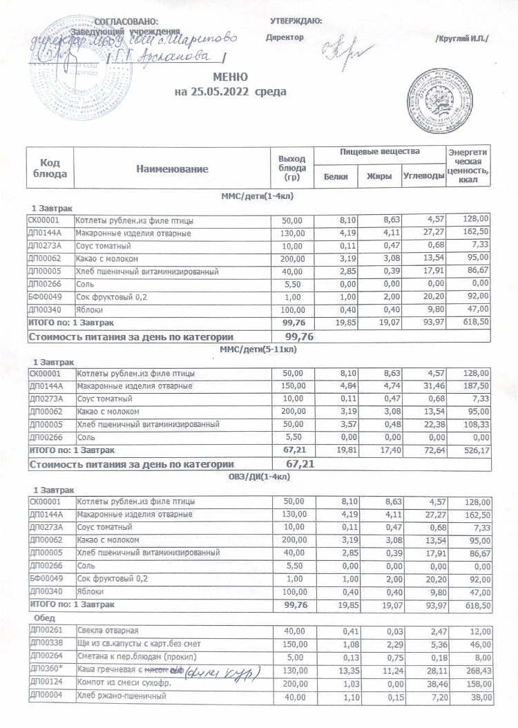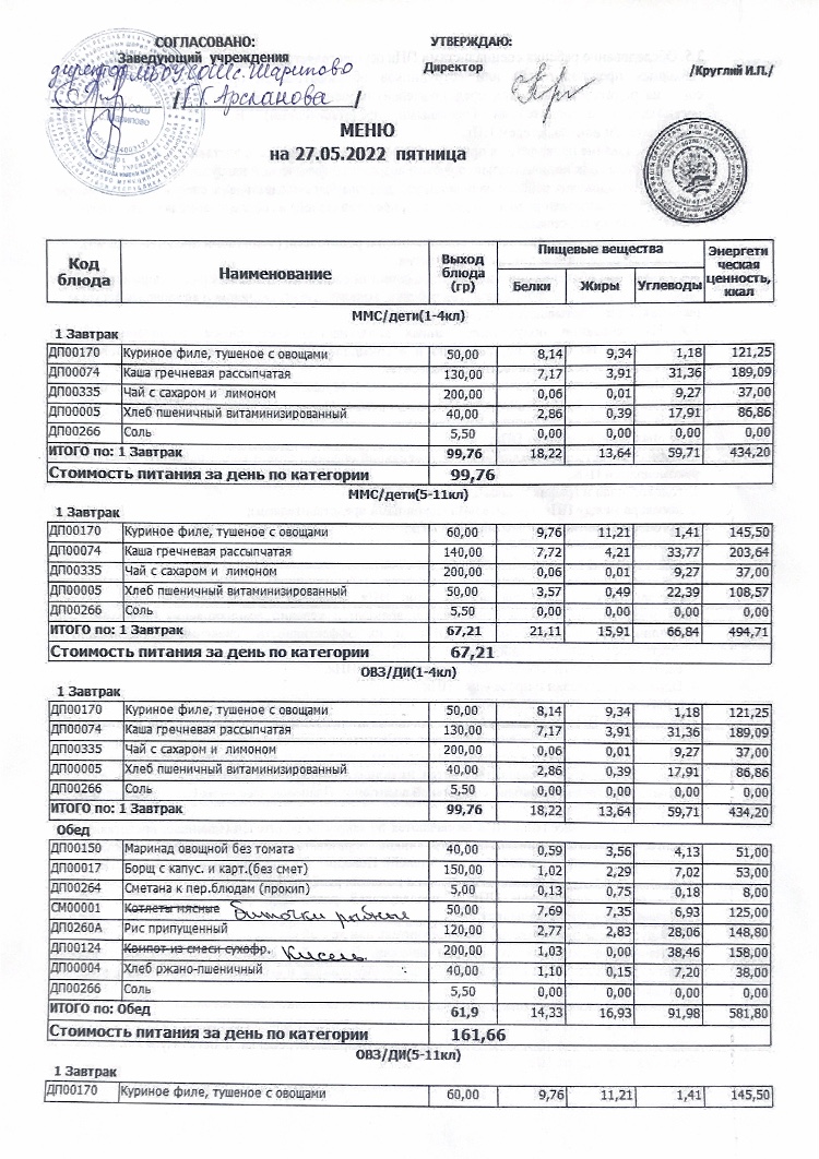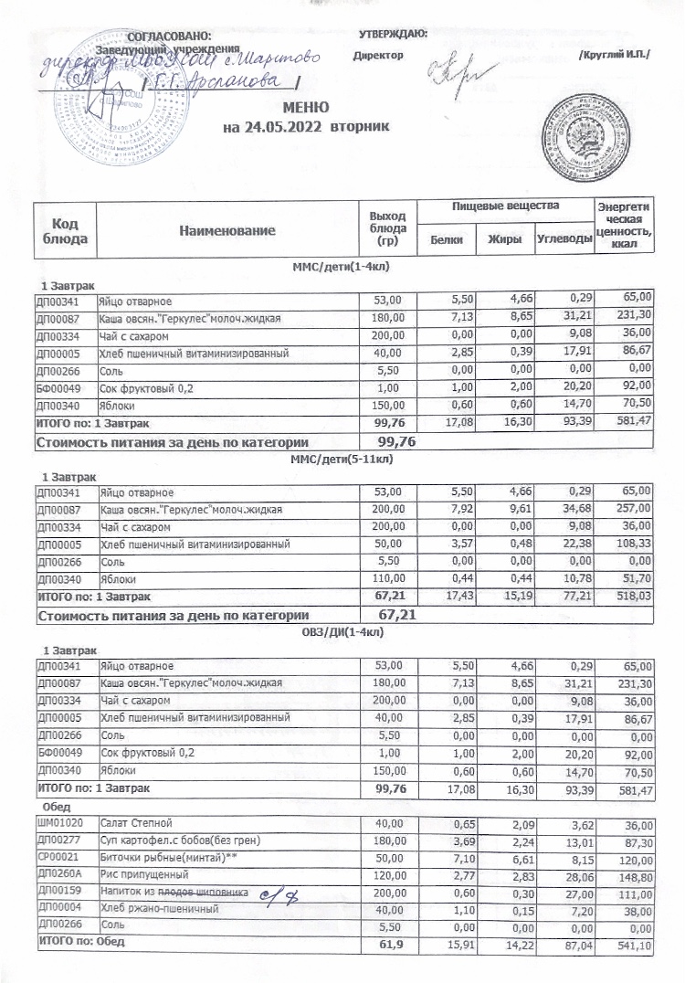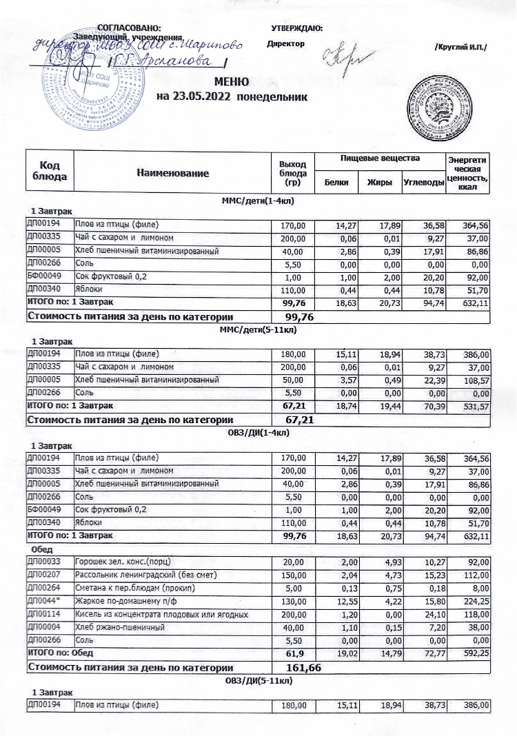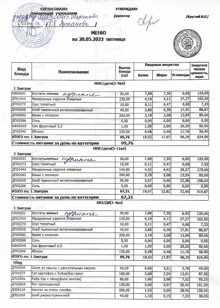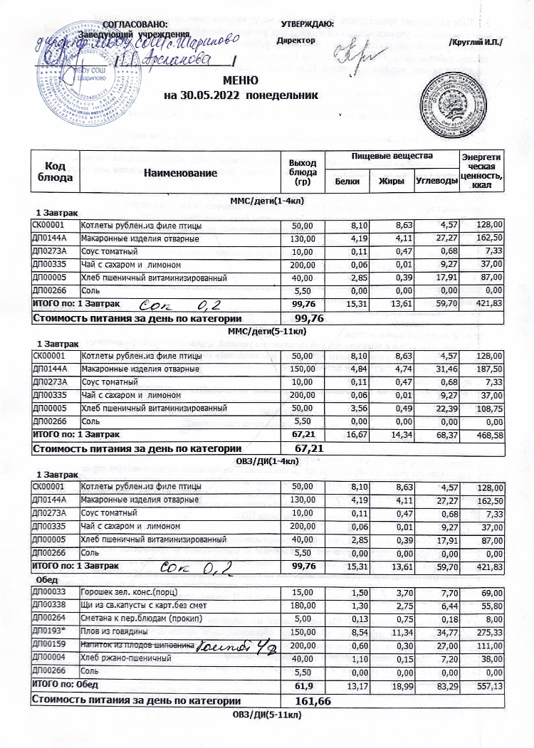 Меню детского лагеря "Солнышко"