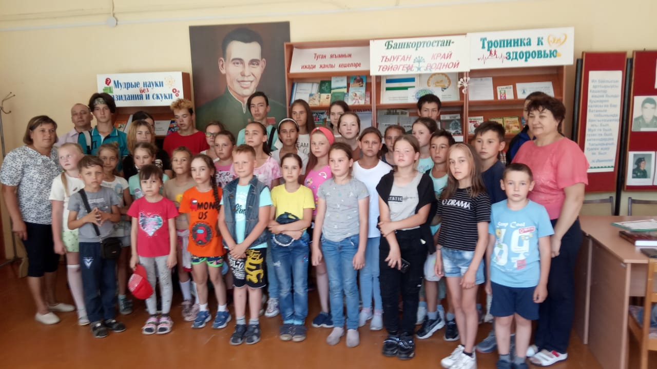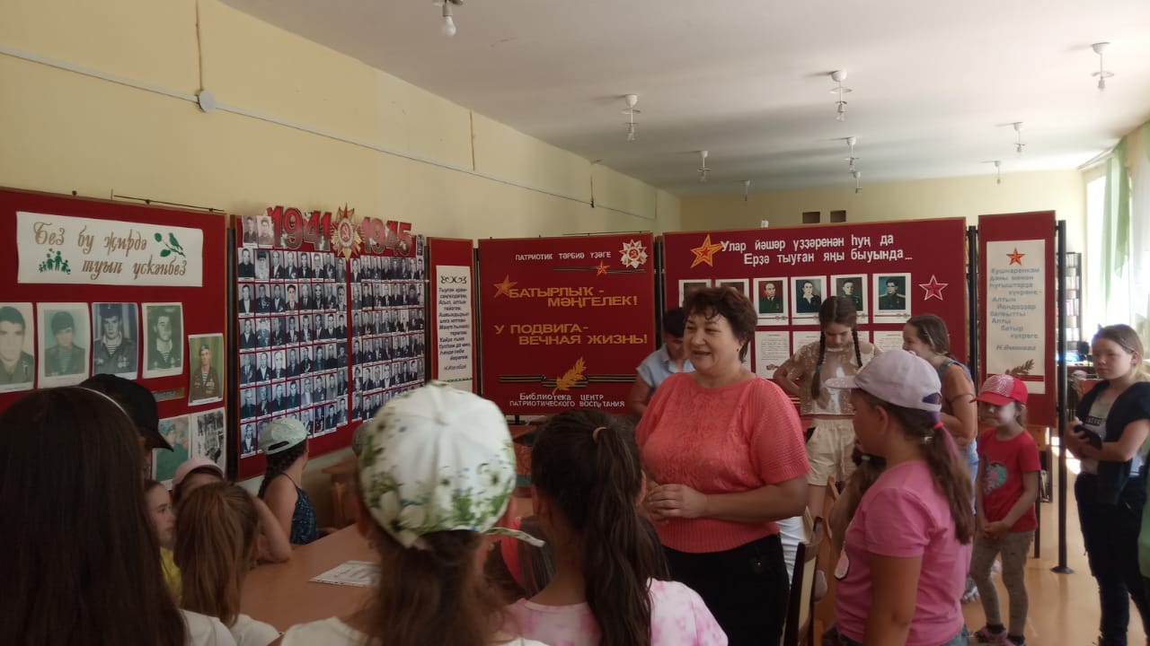 Библиотекарь сельского клуба Рузида Сафаргалиевна пригласила детей в библиотеку, где рассказала об участниках ВОВ села Ахметово. Показала им книги о герое Ф.Ф.Ахмалетдинове. Дополнил рассказ библиотекаря наш учитель Ахметзянов Х.Р.